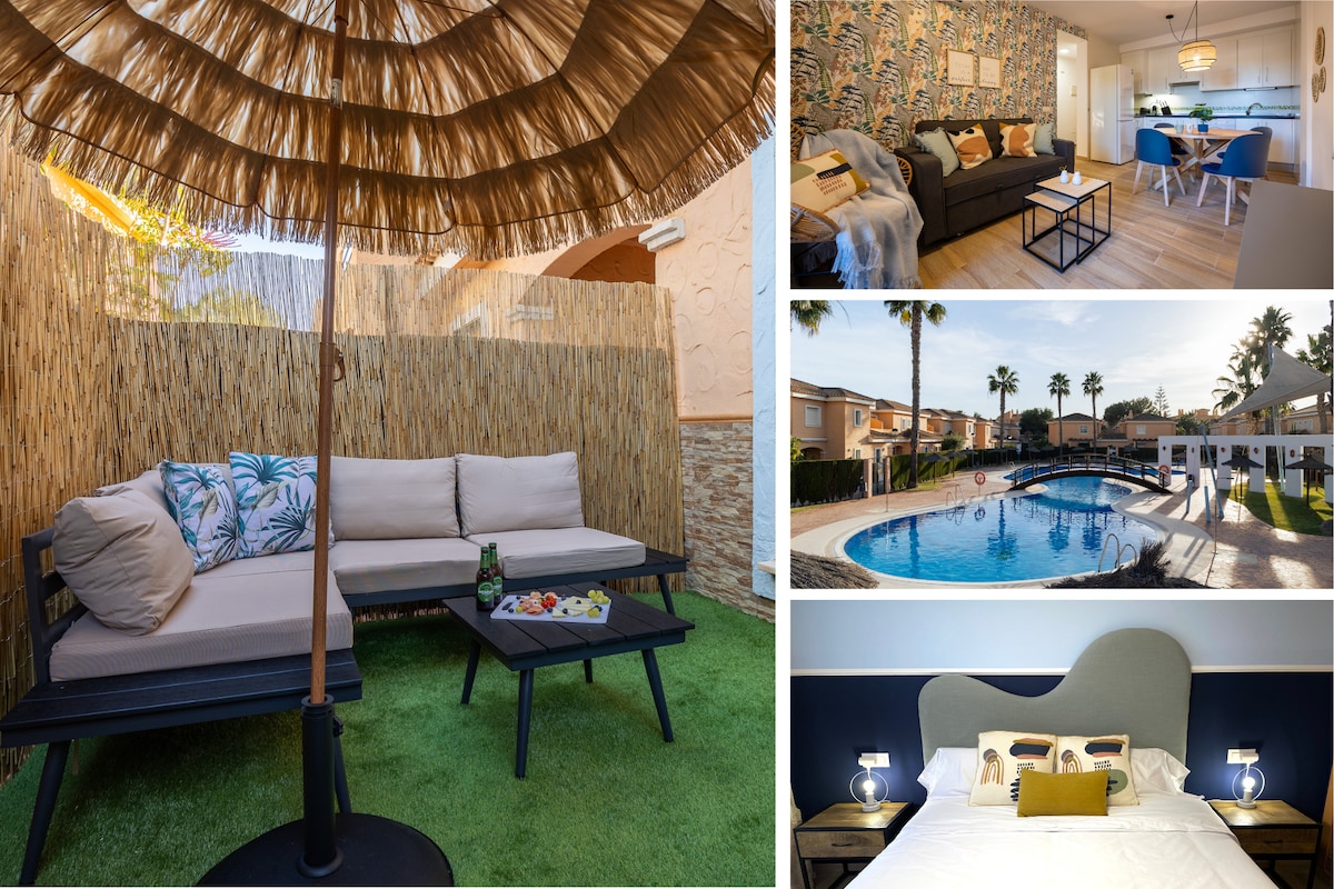 *Piscina disponible todo el año. Descubre Marinas Sunset, a 300m de playa. Relájate en su solarium, cena al aire libre o sumérgete en sus piscina rodeada de jardines tropicales y palmeras. Imagina un día perfecto en la playa y luego regresa a tu casa de dos habitaciones equipada con todo lo necesario para descansar y disfrutar, incluyendo AC y fibra óptica. Disfruta de un entorno acogedor con una decoración de mimbre y tonos blancos. ¡Reserva ya y vive unas vacaciones inolvidables!
