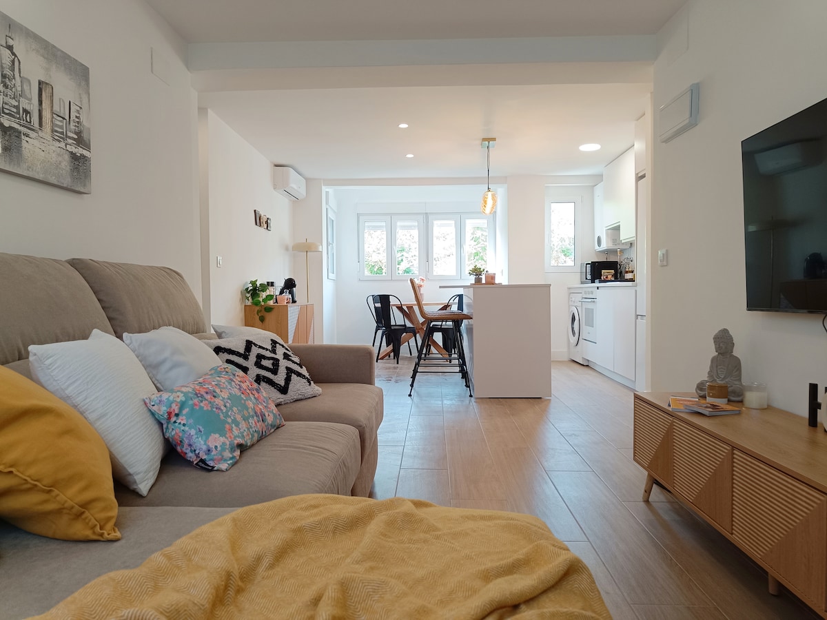 The restoration and decoration of the flat was finished on sept 2017, with grate open spaces and super high ceilings (4 metres high) its and oasis of peace, thanks to the exterior glass and metal balconies that can be closed completely, and the wood windows that go from floor to selling on the outside facade. To the inside the flat overlooks a typical Spanish patio