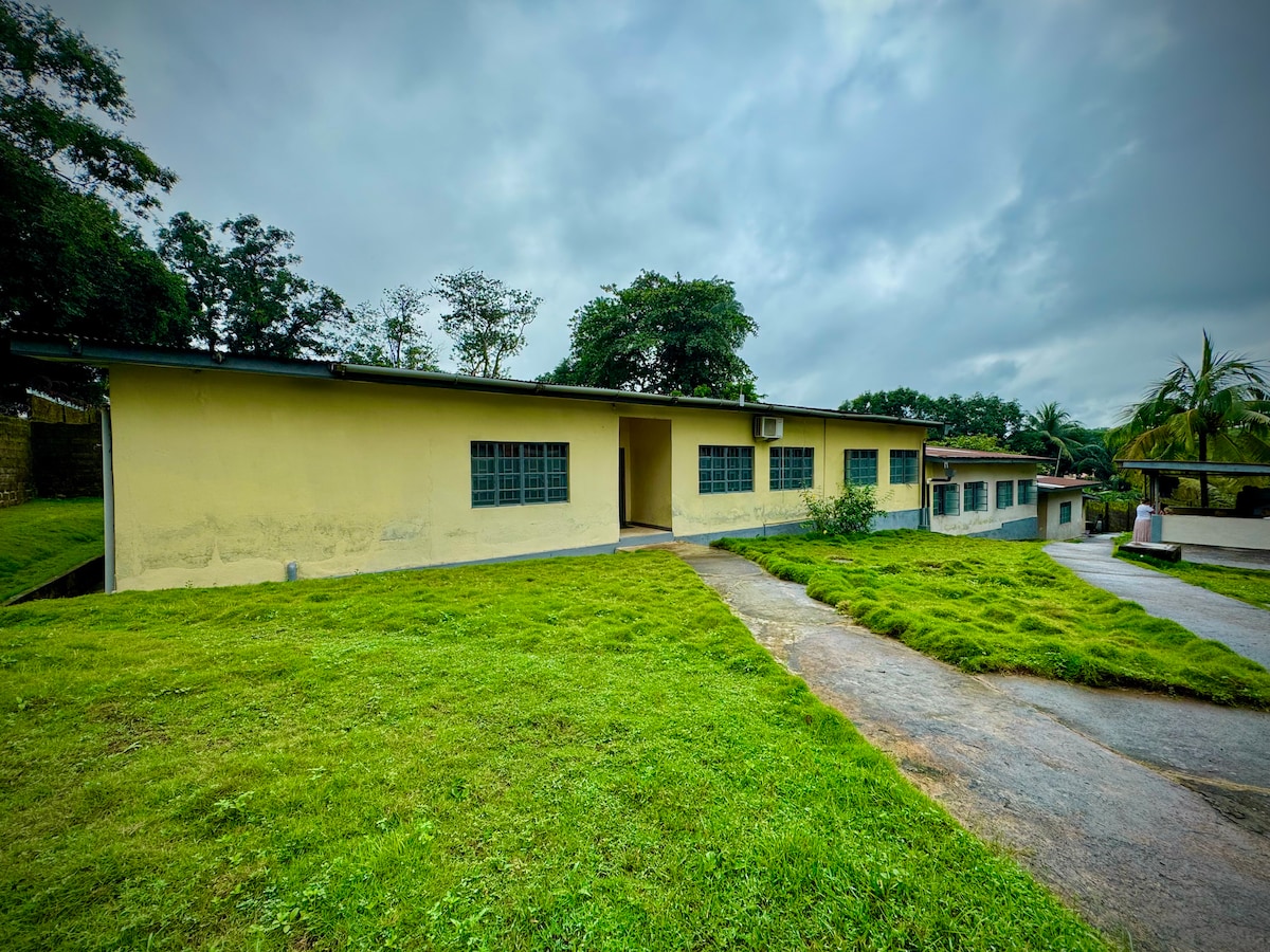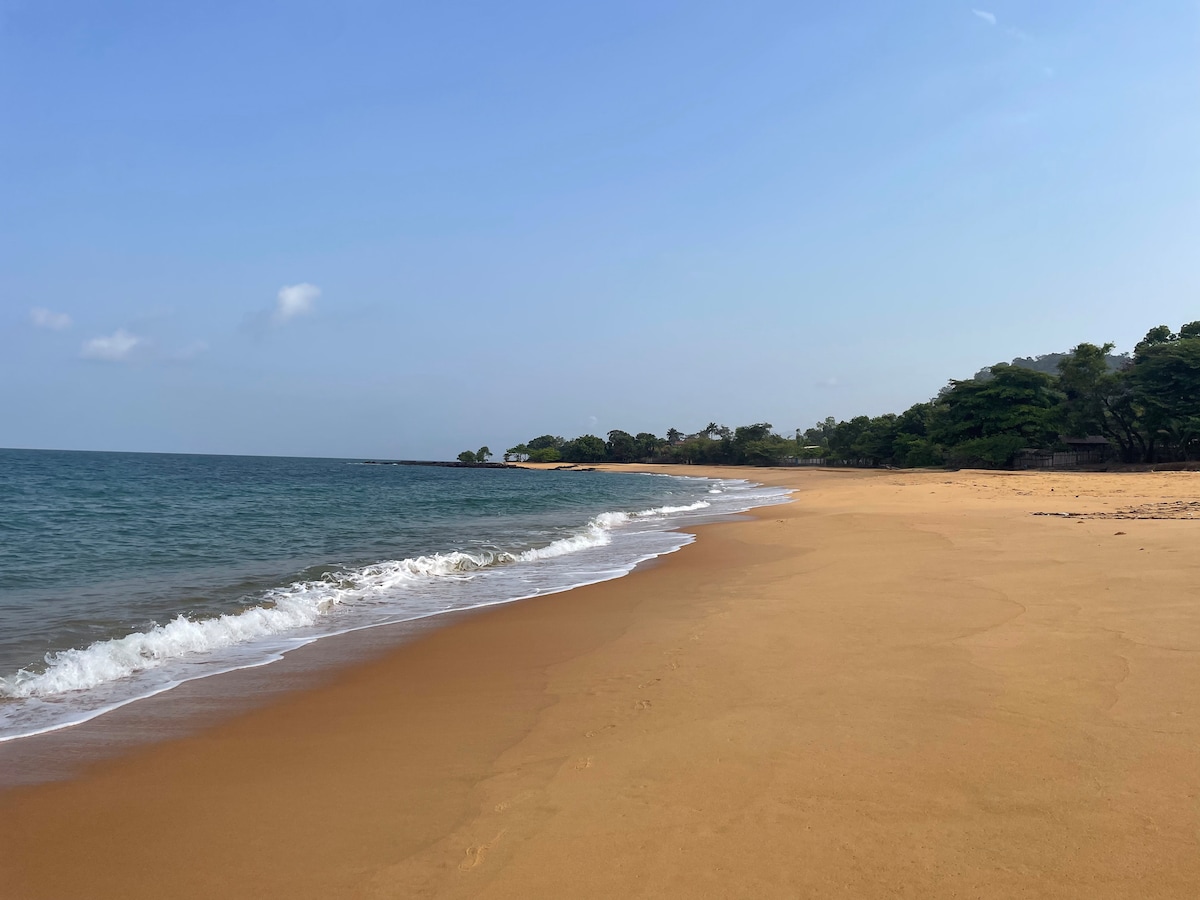 Paradise in Lungi! Only minutes from Lungi International Airport, the Roundhouse at Muh Boneh camp is the perfect peaceful getaway. Whether you're here for a long stay or just need a quick rest before crossing to Freetown, you will find everything you need here. Enjoy queen sized beds, a modern kitchen, hot water and air conditioning- all with the sounds of nature right outside your door.