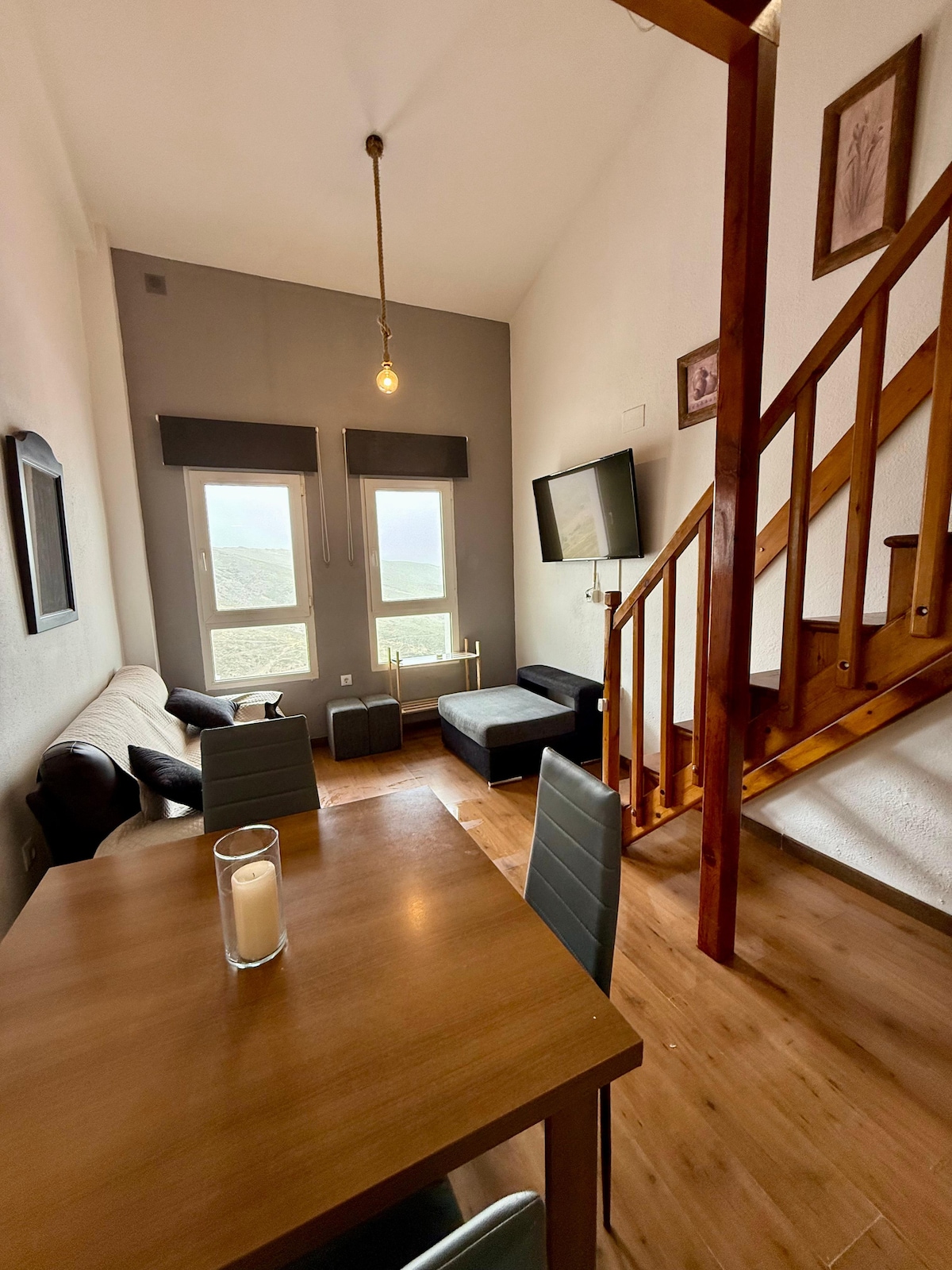 Luminoso y acogedor apartamento con salón amplio y cocina abierta. Increíbles vistas al pico Veleta, Granada y al atardecer. Cuenta con un dormitorio con una cama (150x200) y armario, y dos camas plegables en el salón (80x180). Además dispone de armario para los abrigos y espacio para colocar botas, esquís y tablas. El piso está equipado con mesa para 4 pers., radiadores, Smart TV, chimenea eléctrica, secador, plancha y utensilios de cocina: microondas, cafetera italiana y de cápsulas, etc.