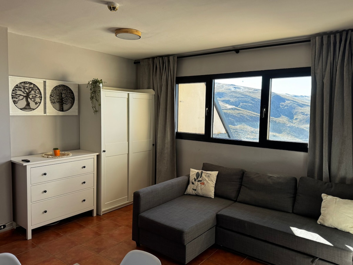 Espectacular Apartamento con vistas a las pistas en la zona baja de Sierra Nevada, con plaza de Garaje, Wifi, Netflix para 6 personas. Edif. Monte Gorbea, detrás de Hotel Meliá a 300 m del telesilla El apartamento está compuesto: salón/cocina con 1 sofá de matrimonio, cama de matrimonio, entrada con litera 2x80cm de 180 cm y baño. Incluido garaje. El check-in/check-out se realiza a 500 metros andando donde esta el apartamento y en coche a 4,5 km porque Sierra nevada solo tiene un único sentido