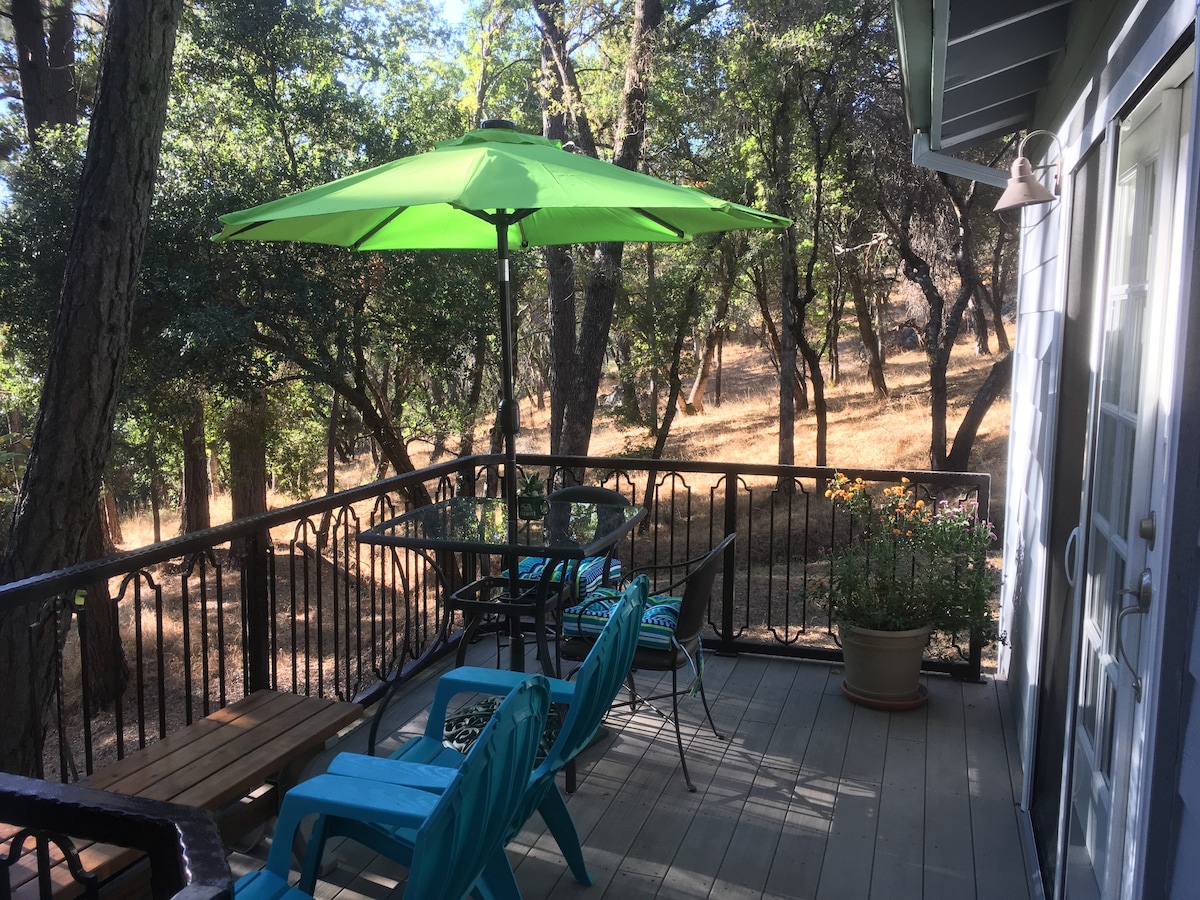 February is off to a lovely, sunny and warm start.! We are a 1 hour and 50 min drive to the Yosemite entrance gate. Oak Nest Cottage is a quiet retreat on 5 wooded acres. The humble cottage is 600 sq feet. Super clean and efficient. The private and quiet cottage includes a kitchenette, bathroom w/ shower, deck, carport and a loft bedroom w/ air cooler. It is comfortably romantic for 2 , safe & affordable for solo travelers.