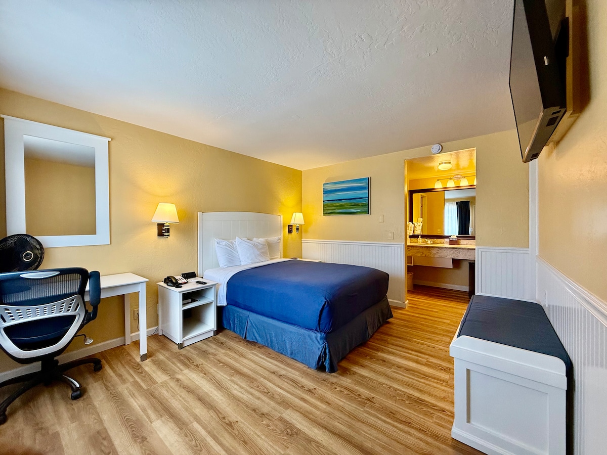 Nestled in a Spanish-style building on main street, our vintage motel offers free parking and convenient access to all your needs. This spacious room combines retro vibes with modern comfort, retaining some of the original structural quirks that add to its unique character. Enjoy the plush bed, separate sitting area and private bathroom. This cozy, clean and comfortable retreat is the perfect blend of nostalgia and convenience for short or long-term stays in our friendly town