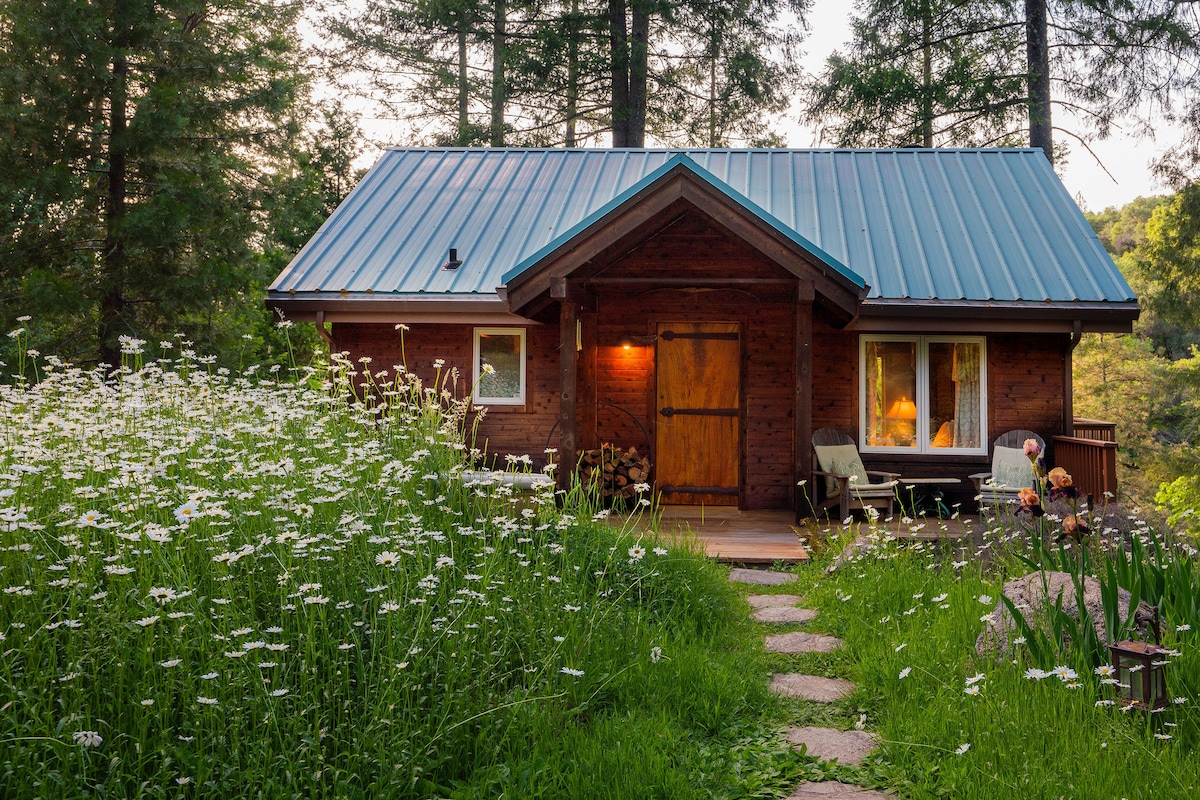 Indulge in rustic-elegance, charm and comfort. Our cabin is built of warm toned cedar wood and floors with all the luxuries: a gourmet kitchen, soaking tub for two, wood burning stove, hot tub. You will experience a full immersion in nature out every window and just one step out the door. Just a short ten minutes from historic Nevada City, shopping, restaurants, theater, Deer Creek trail. Yuba River and hiking trails nearby. This studio cabin is perfect for couples or a solo retreat.