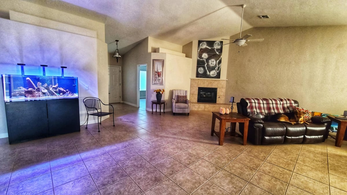 Relax with the whole family at this peaceful, spacious and very cozy home with a private pool and spa located in the Sierra Vista Country Club Estates. This home, that has been in our family for 20 years, is located on the Pueblo De Sol Golf Course. We have yard games including a life size connect four and corn hole, a BBQ grill, fire pit and enough seating for all of your family and friends to get comfortable, enjoy the incredible Southern AZ weather, eat together and make lasting memories!