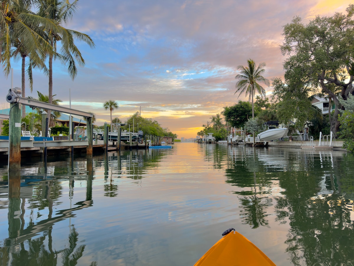 ☞ Sauna, Fire-pit, BBQ (gas) ☞ Giant Outdoor Chess♟️ ☞ King & 2 Queen Beds ☞ Ample Parking (RV, Boat, etc) ☞ Fast WiFi 🛜 ☞ 4 Smart TVs (largest 85 inches) ☞ Gourmet Kitchen Main side ☞ Kitchenette on Guest side ☞ 2 Onsite washer + dryers ☞ 2 Outdoor Showers 》30 mins to airport 》2 mins to Siesta Key Beach Bike to America’s #1 beach, morning coffee runs, sunset rides, live music, ice cream, shops or any of the amazing restaurants in Siesta Key village.