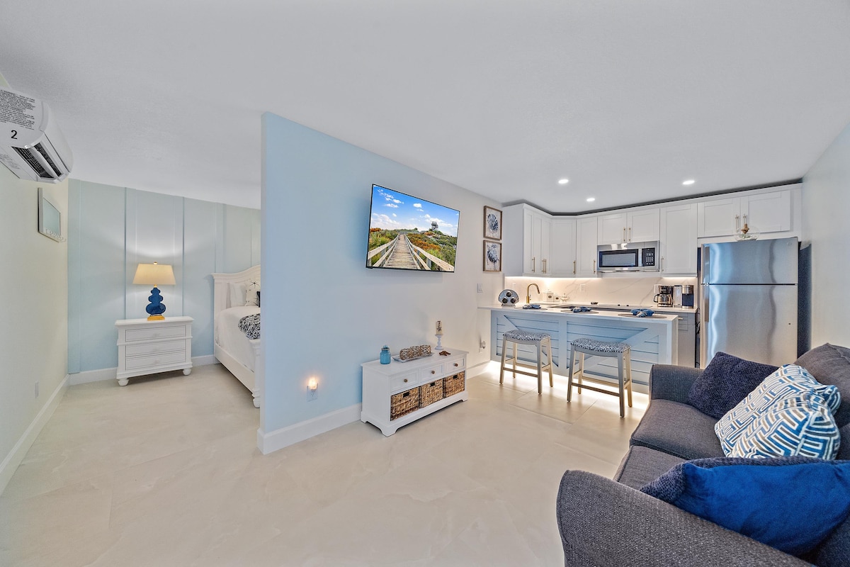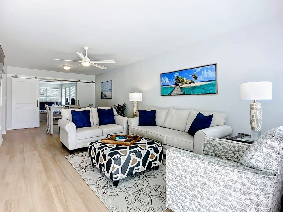 Welcome to beautiful Siesta Key, the #1 beach in the country! Gorgeous newly renovated one bedroom condo within a 5 min walk to the powdery white sandy beach and stunning sunsets. Also next to restaurants, bars, kayak & jet ski rentals, and much more! Contact for monthly rentals available. Experience this modern oasis: • Chic Living Room • Quartz Kitchen Countertops • King Size Mattress • Beach gear • Wifi • Private Parking • Smart TVs • Screened-in Patio • Coin Laundry room on premises