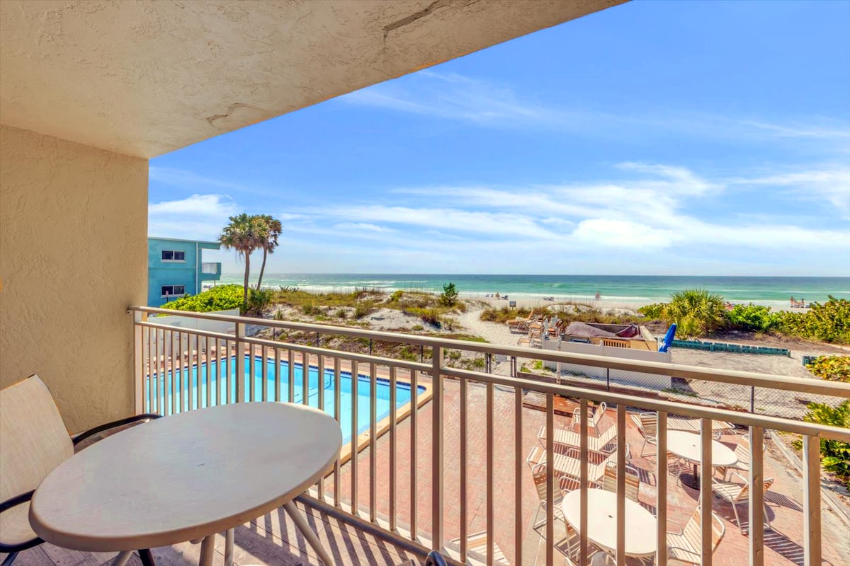 Enjoy ocean views in this 2 bed 2 bath spacious beach side 4th floor condo at Sea Shell Updated coastal decor across from Capt Curts, restaurants, grocery, coffee, ice cream Easy to WALK everywhere No car needed Perfect location Great for families Sleeps 6- 1 king & 2 queens & walk in closets Balcony with GULF views Private beach steps away from bldg. Free beach loungers. POOL Siesta Beach #1 in US Quick Wifi Superhost- 325+ reviews that ave FIVE STAR!