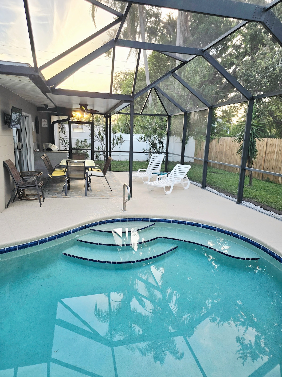 This 2 bed-2 bath house is a homey Florida bungalow with wood floors and lots of natural light, located in a quiet neighborhood on the downtown core edge. Enjoy a spacious and private, fenced-in backyard with pool, covered grill and eating area. The home is minutes away from the Legacy Trail, the new Bay Park, Payne Park, dining, live music, bars, theatres, opera house, performance venues, comedy club, antiquing, kayak launches, tennis and basketball courts, farmer's market, shopping and more.