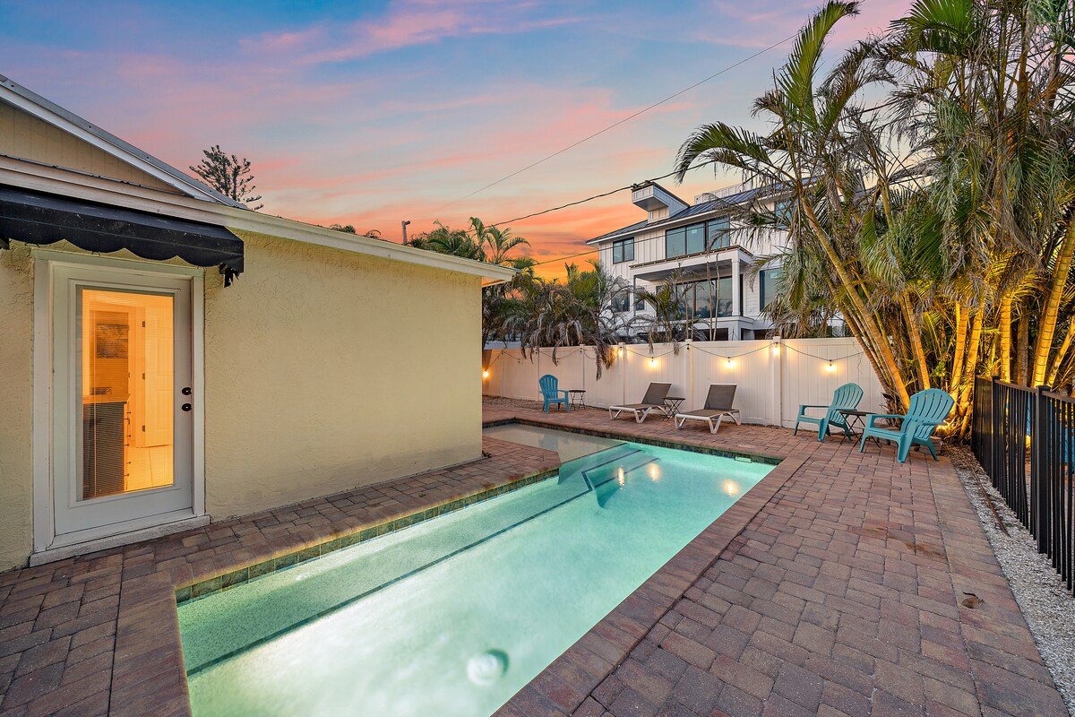 Nestled on the serene Crescent Street, this classic 1969 cottage, is just a short walk to the ground quartz sands of Siesta Key. The 500 sq foot private brick paver and stone backyard off the screened in lanai is fully fenced with custom built stainless outdoor kitchen, featuring a large grill, refrigerator, custom built stone bar with seating for 8 . Nearby is a blue glass gas fire pit with a seating area, over sized (9 ft. diameter) in ground "spool", loungers and a large circular daybed.