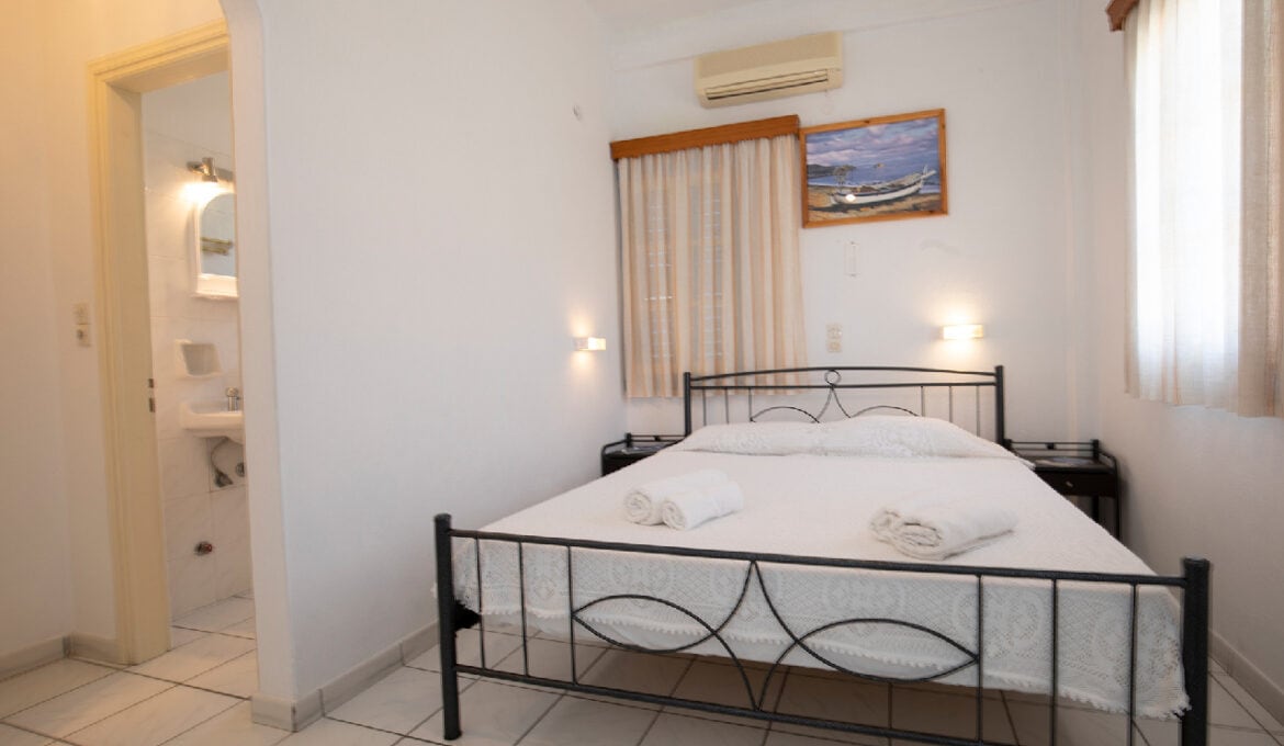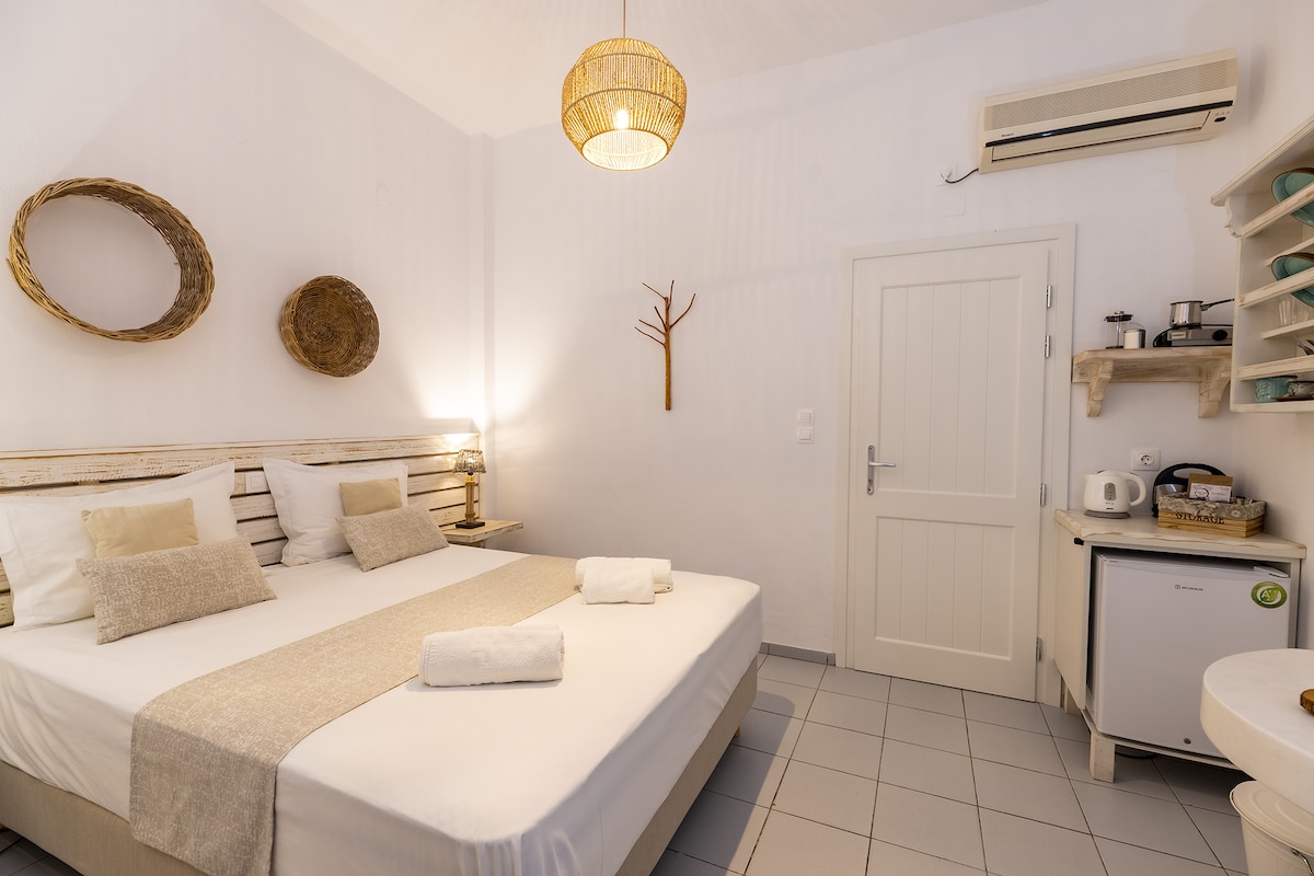 Nos chambres sont situées a 60 metres de la magnifique plage de Kamares. Le port est a 600 metres,village sympathique ou vous trouverez toutes les commodites; tavernas, cafes, commerces, artisans potiers (specialite de l ile) ... Cette chambre en rez de chaussee est équipée d'un réfrigérateur- bouilloire- tv-air conditionné-wi-fi et d un grand jardin partagé avec les autres studios.Nous vous attendons dans un environnement calme et familial.