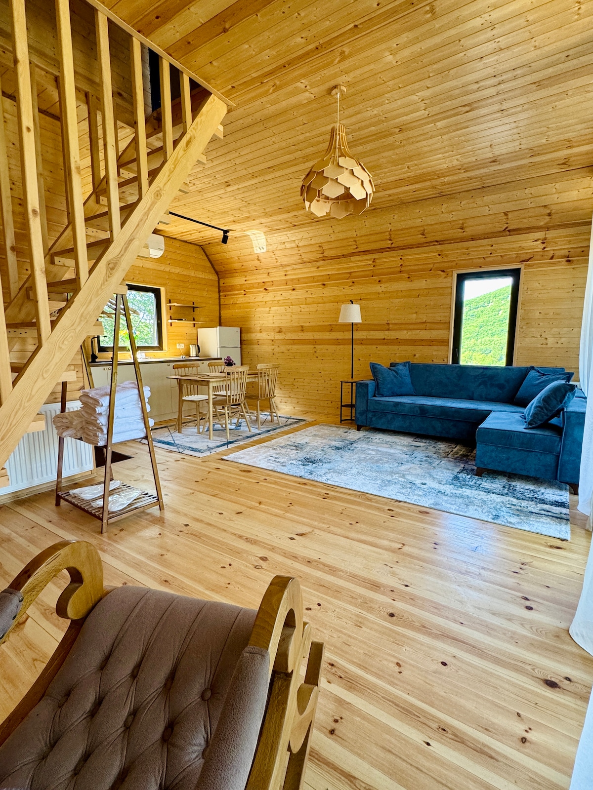 Discover a peaceful retreat with 180° panoramic views of the Alazani Valley and the Caucasus Mountains. Ideal for getaways, retreats, and intimate stays. Enjoy sunsets on your private terrace, shakshuka made by our local chef, culinary classes, Georgian wine tastings, and our signature barrel sauna, all designed for rest and reflection. ⚠️ Important: Due to the natural terrain, multiple stairs, and the possibility of wildlife encounters, children under 10 are not allowed.
