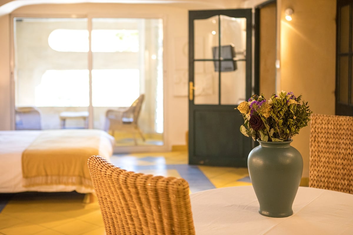 Hotel de charme, vielles pierres 1857 , calme et spacieux, chambre de caractère, lit king size , prestation ménage. Grand jardin fleuris, collection de cactées, grande piscine à 50 m de la mer. wifi gratuit. Petit déjeuner gourmand maison servis autour de la piscine, sur la terrasse vue mer, ou sous la pinède. Garage fermé payant, gratuit dans l'impasse, chien admis avec supplément. ping pong , boules.