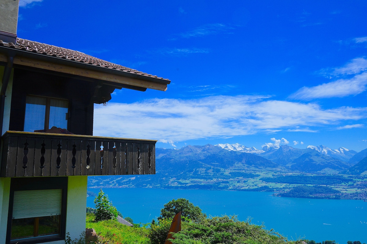 Chalet avec vue splendide sur les montagnes suisse et lac de Thoune à environ 900 mètres d'altitude dans la région de l'Oberland bernois Un jardin clos et 2 grande terrasse panoramique 1 haute ou vous pouvez manger faire manger faire un barbecue, prendre votre petit déjeuner, dîner en admirant la splendide vue ainsi qu'à l'intérieur dans la salle à manger au niveau de la chambre ou vous pourrez profiter de chaise longues et d'un whirlpool avec musique