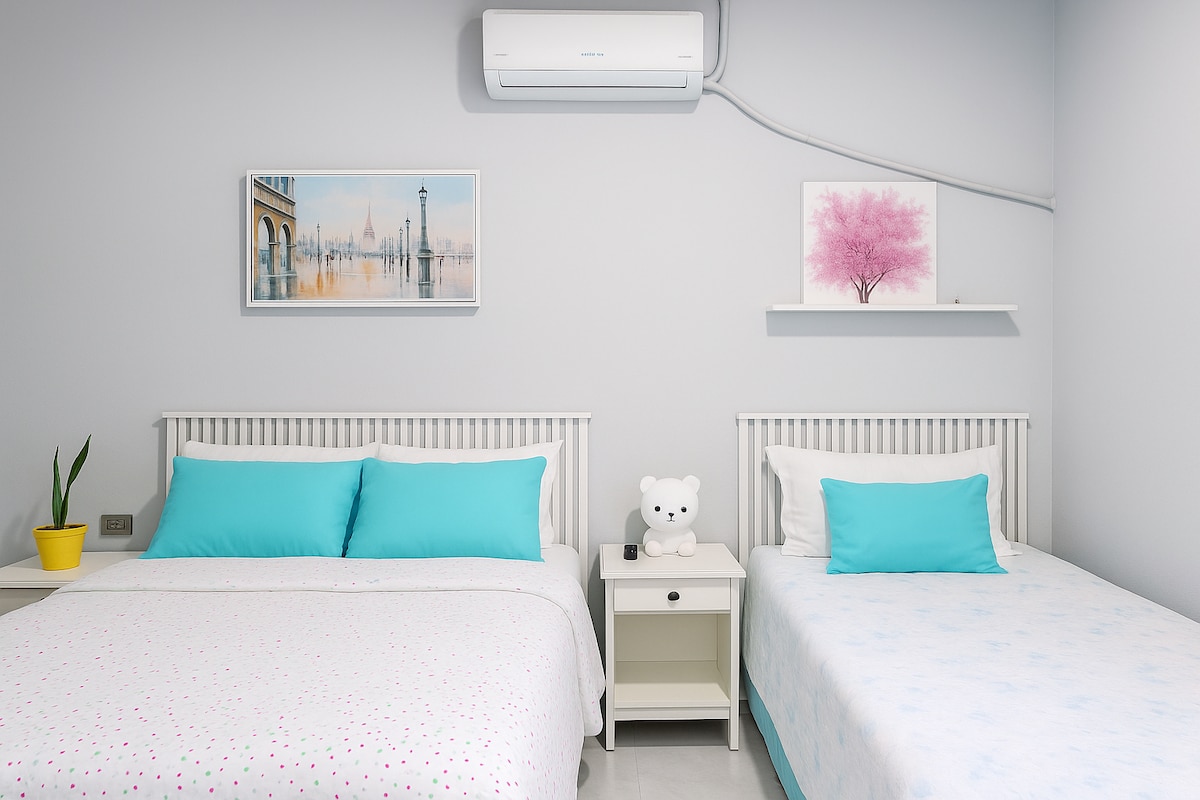 A/C in the rooms, big and safe parking space good for a couple or big family of up to 6 with lots of space, tranquility, minutes away from restaurants. no dirt road to access.