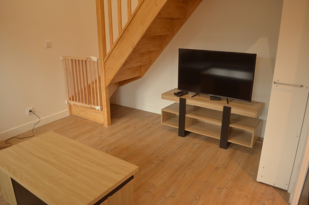 Petite maison individuelle de 2 pièces dans village calme avec boulangerie - épicerie. Ce logement est composé d'une chambre (1 lit 2 places en 140 et 1 lit de 70), d'une salle de douche et d'un WC séparé à l’étage, d'une pièce à vivre avec cuisine aménagée et équipée au rez de chaussé avec clic-clac et WC indépendant. TV, four, micro-onde, frigo top, cafetière + Nespresso, grille pain, bouilloire, serviettes, torchons, draps et couettes fournies. Parking 1 place et jardinet PAT & SYL