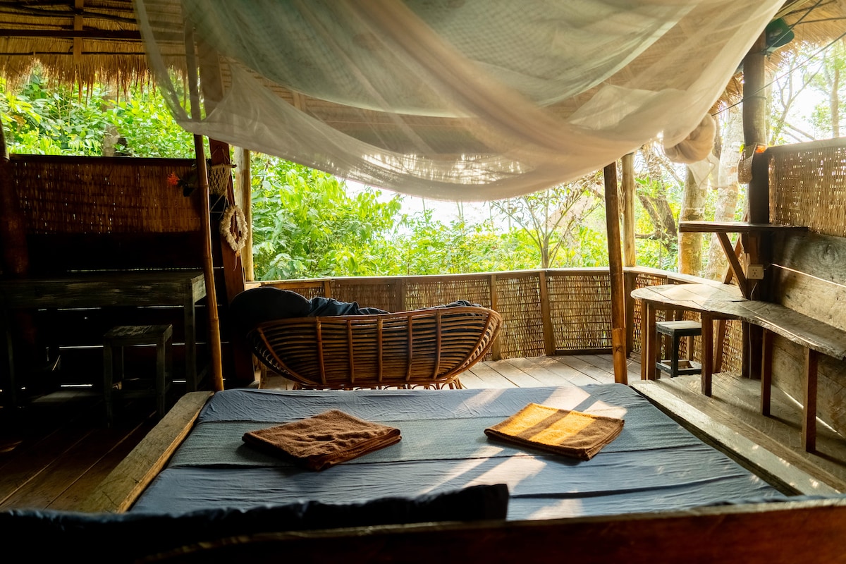 Our smallest and cheapest bungalow, made from wood with straw roofs. The low budget bungalows simple. Each bungalow comes with a double mattress, lockable storage box and mosquito net for your comfort. With perfectly placed chairs on your own small terrace you will have the ideal spot to relax. This bungalow comes with shared facilities, cold water, light is provided through solar system, community loading station operated only during the day at the reception.
