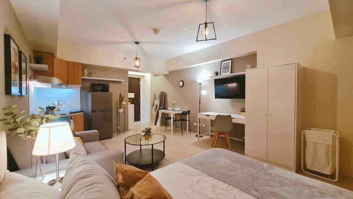 Looking for a cozy, minimalist spot for work or play? Our 17 sqm unit is perfect for business stays with its strong Wi-Fi, and just right for a relaxing city getaway. Heads up: being along the main road means some traffic noise, but the comfort, convenience, and city energy make it all worth! * Cozy Minimalist design * Unlimited Wifi use : 250 Mbps PLDT * Free Netflix & You Tube * Free use of card and board games * Cotton Linen&Towels * Kitchenette * 32-Inch TV * 1 HP Smart AC split type