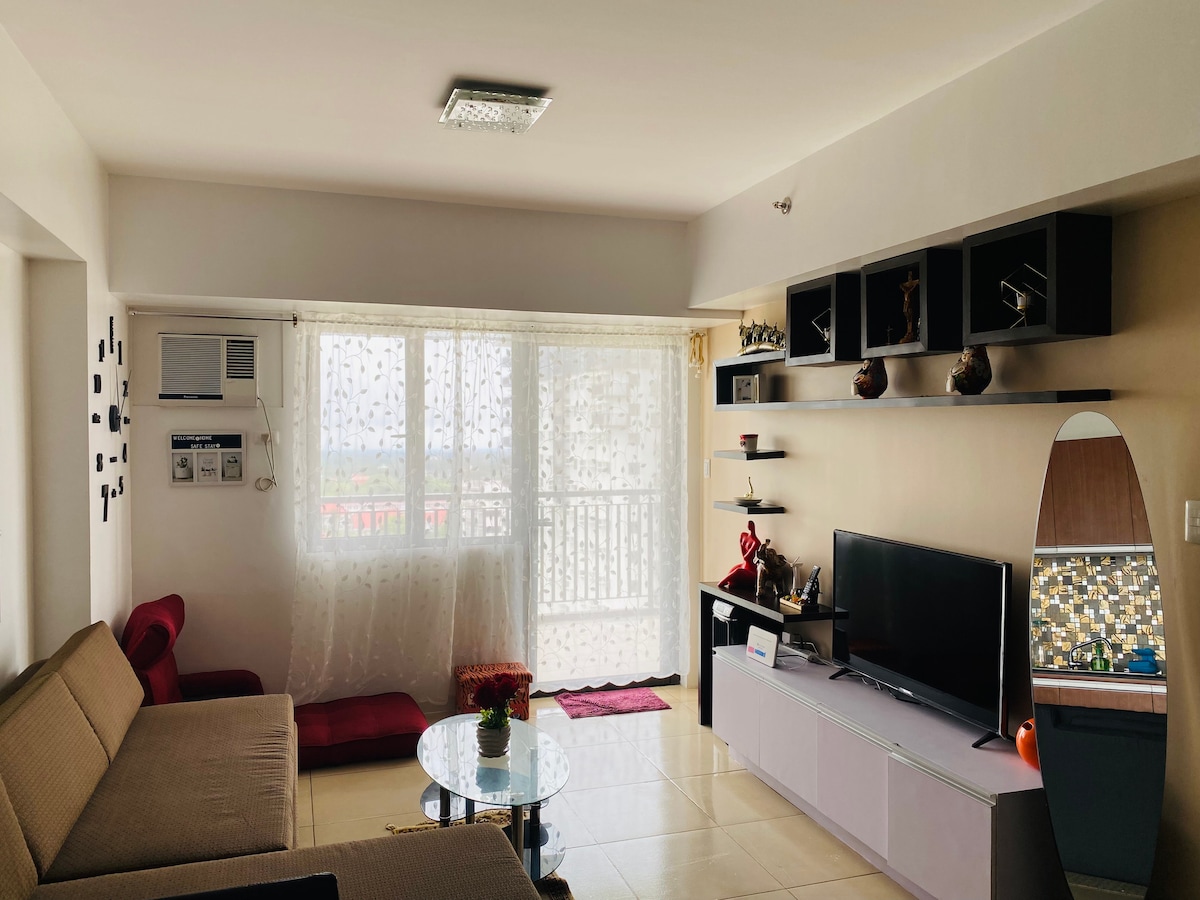 Relax in a logcabin-inspired duplex unit with 2 actual bedrooms and a spacious attic converted into a 3rd bedroom. It is a family home with fast internet, Cable TV, landline, air conditioned bedrooms, heated showers, full kitchen, Netflix, and open parking for 2. It is perfect for families who want a safe and quiet place to bond in. There is no Taal view from here, but the neighborhood is beautiful, lined with pine trees.