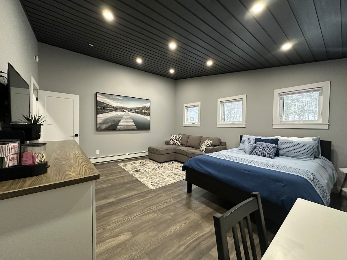 2nd floor guest suite located only 5 minutes to downtown Bancroft. This large suite has a queen bed, queen pull out sofa bed, mini fridge with freezer, microwave, smart tv, keurig machine (tea, coffee, sweeteners and creamers provided) and spacious bathroom with walk in shower. Please note that a full flight of stairs must be climbed to access this unit once inside the door. Please also note there is no kitchen in this suite, cooking appliances & candles are prohibited due to fire risk.