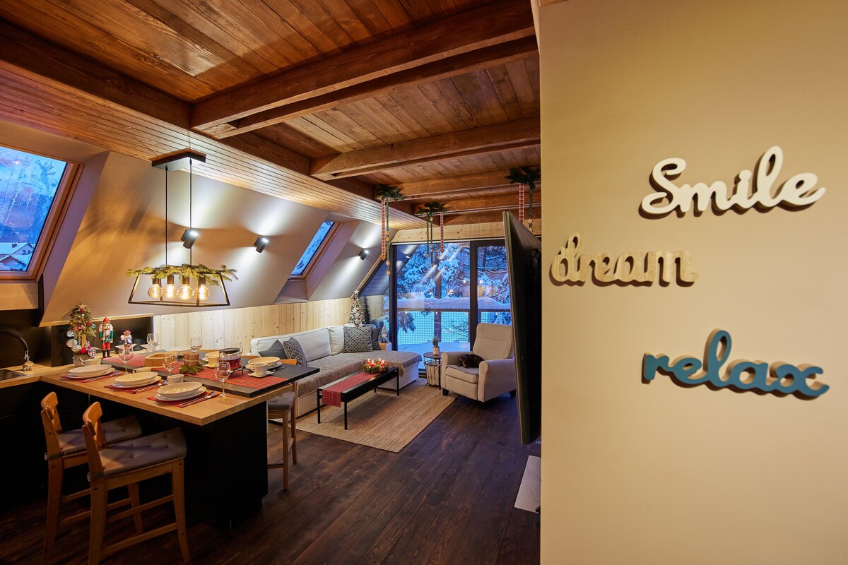 Welcome to Chalet Pine Tree, where enchanting views of Babia Góra mountain meet the charm of a wooden retreat. Breathe in the crisp mountain air from the expansive deck or unwind in the jacuzzi while soaking in the panoramic beauty. Inside, modern interiors seamlessly blend with the cozy warmth of a wooden house, creating the perfect balance between comfort and nature. Revel in the tranquility, indulge in the breathtaking scenery, and let this chalet be your escape to mountain serenity.