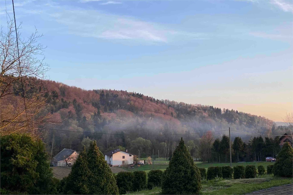 Find peace at "Closer to Heaven" a luxury retreat on Koskowa Mountain, 820m above sea level. Enjoy panoramic views of the Beskid Wyspowy and Tatra Mountains from a spacious terrace. This 88 sqm eco-friendly home is surrounded by 2,300 sqm of private land. Unwind in the year-round 5-person chlorine-free outdoor spa with 2 reclining massage seats. Pure spring tap water, an ice-maker fridge, and fast Wi-Fi add comfort. Trails, forests, and nature await – closer to heaven, closer to you.