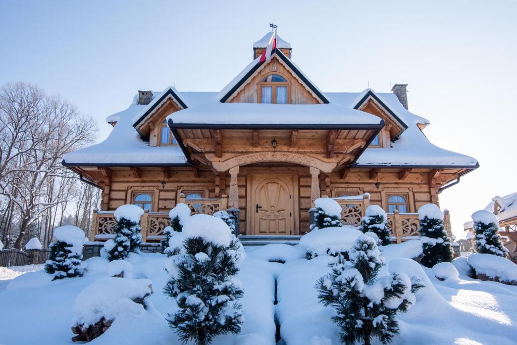 Drewniany domek góralski, 11 osobowy z pełnym węzłem sanitarnym (2 łazienki z prysznicem, umywalką i ubikacją), z zapleczem kuchennym (kuchnia elektryczna, mikrofalówka, czajnik elektryczny, lodówka, naczynia i sztućce).