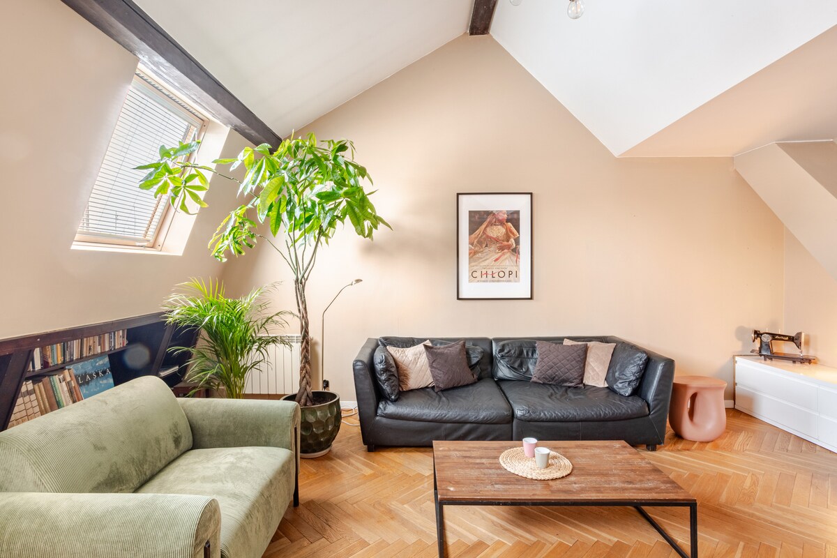 This unique, two-level apartment in the attic of a pre-war modernist tenement house is particularly special to me, as I spent my entire youth here. It was my family home. Spacious and bright, with plenty of shared space, it’s an ideal choice for families or groups of friends. The large windows and impressive four-meter-high ceilings create a truly unique atmosphere. A major advantage is its proximity to Wolski Forest and other green areas, as well as convenient access to the historic center.