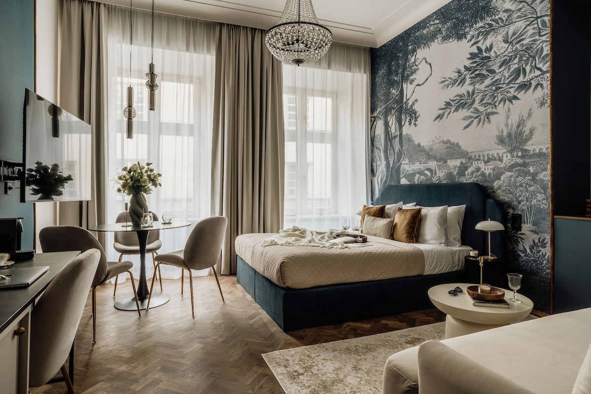 Prawdziwa perełka w naszej kamienicy – wyjątkowy apartament położony na ostatnim piętrze, stworzony z myślą o relaksie. To miejsce ciche i niezwykle przytulne, idealne na kameralny pobyt, kiedy szczególnie docenia się odpoczynek. Jedną z największych zalet apartamentu są przeszklone drzwi zajmujące niemal całą ścianę, które wpuszczają mnóstwo naturalnego światła i otwierają wnętrze na piękny, a jednocześnie bardzo spokojny widok. To doskonałe miejsce na poranną kawę.