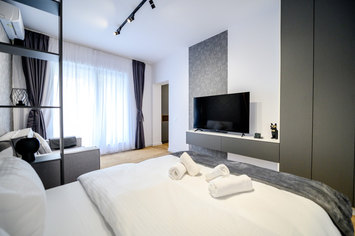 Enjoy a stylish experience in the center of Otopeni in the newest residential neighbourhood there is. All new buildings, private park, your private outdoor garden and many others. The listing is a state of the art studio, designer made with unique furniture pieces that stands out from all other listings. It's the perfect choice if you want to visit: Therme Spa, Olympic swimming pool, Airport, etc. also very close to bus station that goes directly in the heart of Bucharest into the "Old city"