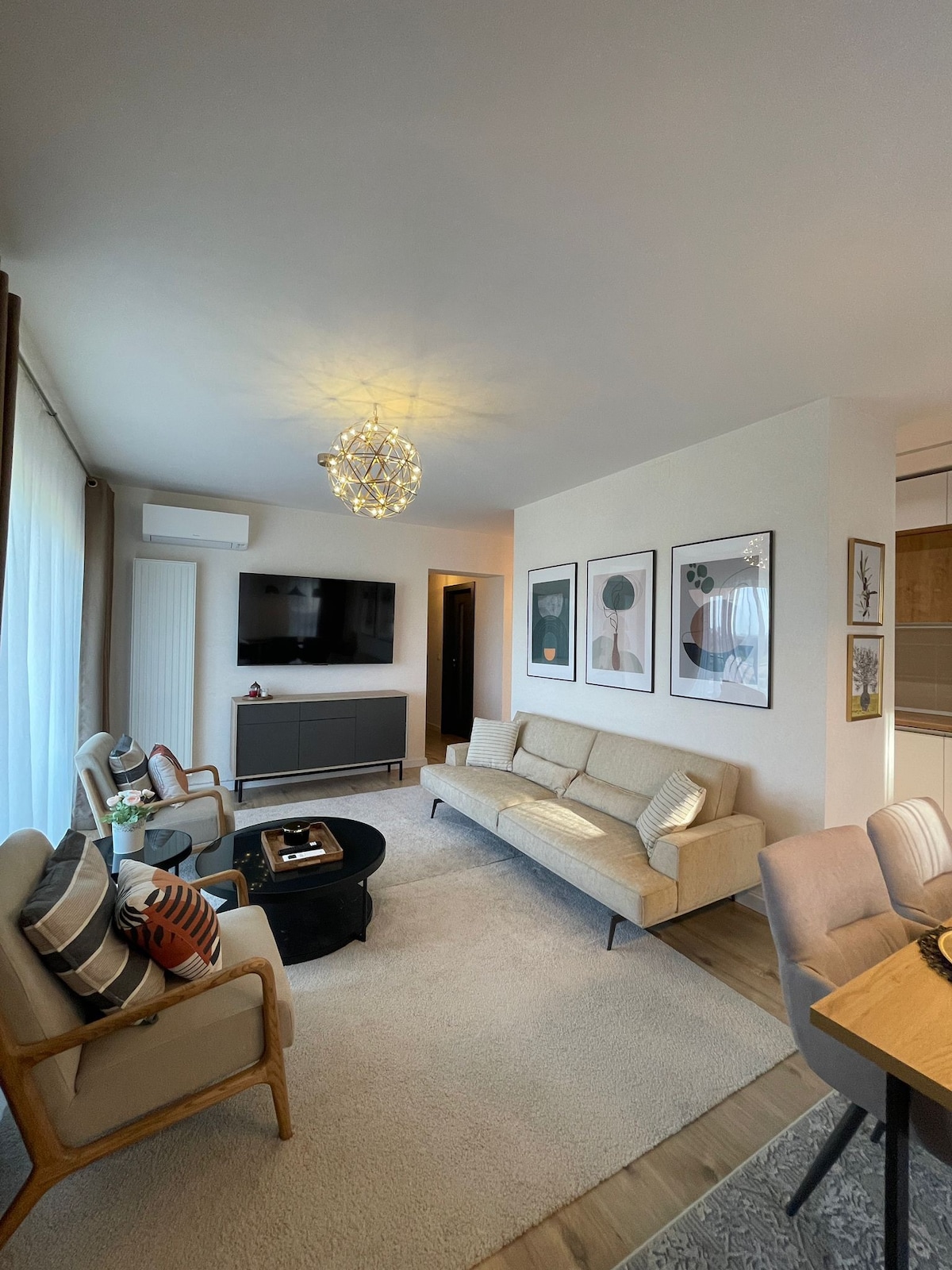 Every home is different and everything you could ever want is here. This premium remarkable apartment is an excelent deal. 2 bedrooms with 160 x 200 beds, 1 livingroom with an extensible couch that can accomodate up to 6 persons, 2 bathrooms with tub. Gym, mall, business district, restaurants, underground metro, fully equipped kitchen, coffee and tea stations, washer & dryer, hairdryer, steam iron, 2 large TV, 3 AC silent units, gas boiler. Free WiFi, free parking, new block. Perfect location.