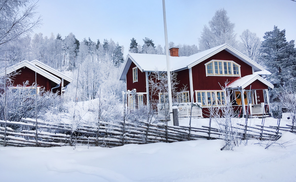 Luxurious house for up to 12 people with 3 showers, sauna, large well equiped kitchen. Situated in Swedens most beautiful area close to the siljan lake, dala villages and the home of Santa Claus. Skislopes, forestpaths and swimming just minutes away.