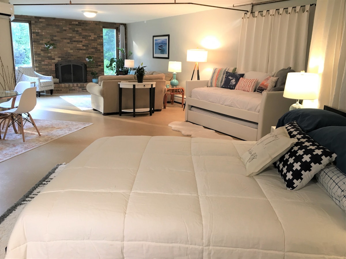 Enjoy your stay in a cozy, yet spacious apartment. Full bath tub for warm baths during the chilly season and shower to wash sand off your feet from trips to the beach only 9 minutes away. You can relax on the couch & watch Netflix, enjoy a warm beverage with your guests around the table or lounge in your own Queen-sized bed. There are many options for casual & fine dining, shopping, walking trails, enjoying stunning sunsets at Lake Michigan & wine tours just minutes away.