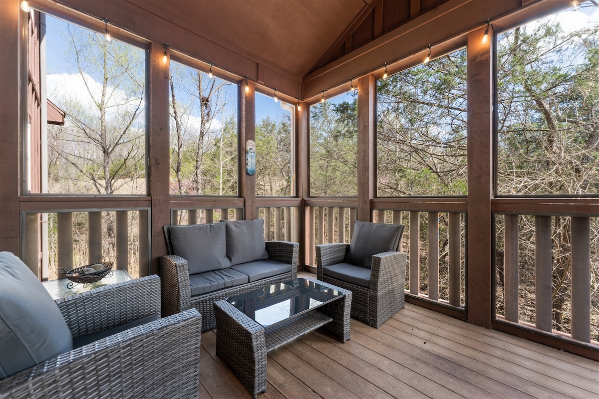 Welcome to Black Bear Cabin! Located in the beautiful gated community of Stonebridge Village, situated on one of Branson-area's top golf courses. This peaceful and cozy cabin offers 1 large master bedroom with private en-suite, with additional sleeping space provided by a pull out sofa. You’ll love sitting in front of the electric fireplace or in the screened in deck and enjoying the quiet setting. All amenities open to guest including pools, country club, ball courts & more!