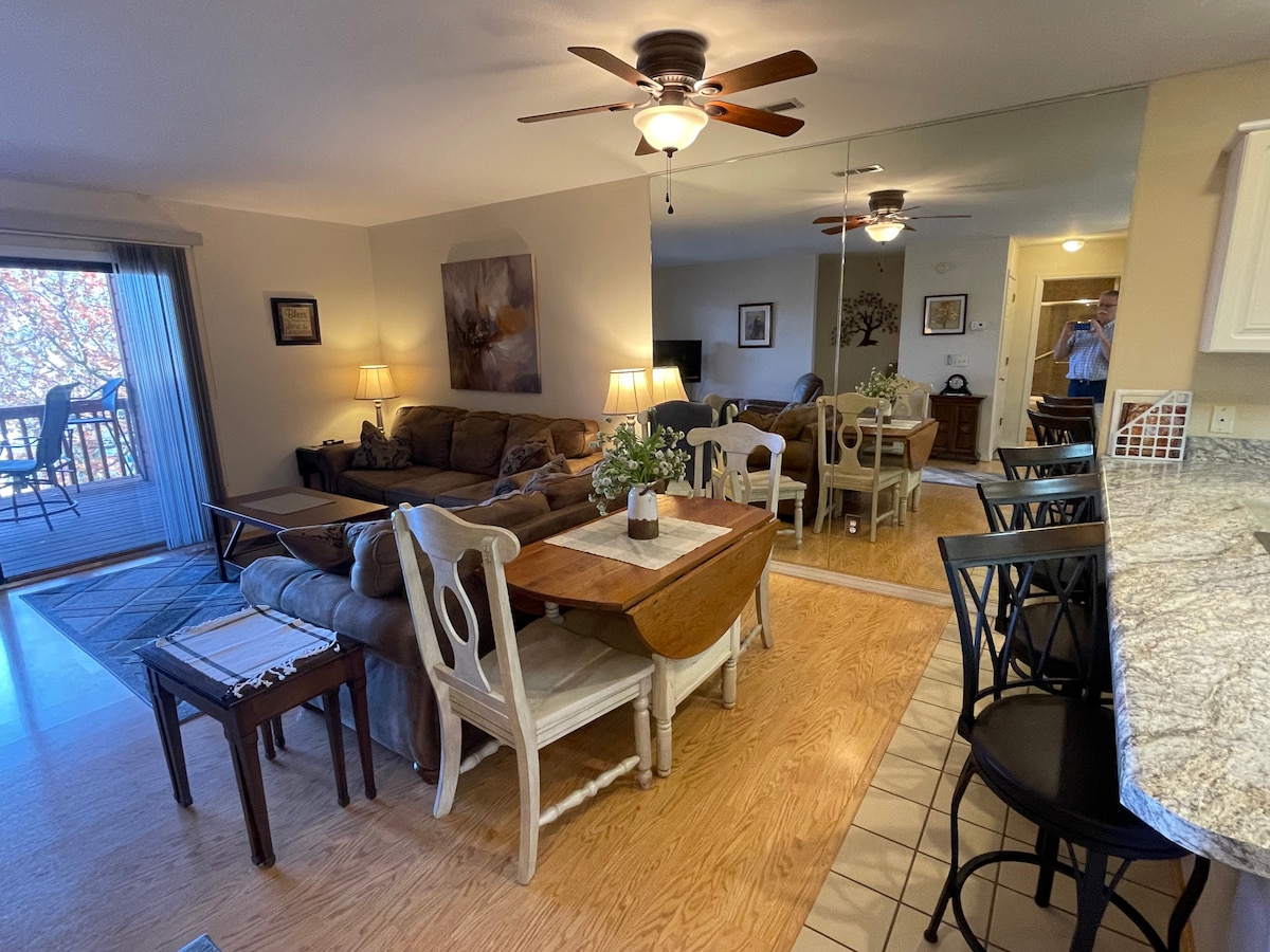 Enjoy Branson and lake life in this centrally-located condo on Indian Point. 2 bed/2 bath w sleeper sofa to sleep 6, fully equipped kitchen w/ coffee. Need more space? - we have another unit if you want to book both. Direct lake access. Only 1 m to Silver Dollar City with the Landing, golf courses & shows just minutes. Pool, hot tub, tennis/pickle ball/bball court, playarea and trail to the lake. Large screened walk out deck. Free WIFI, cable and smart TVs. Full laundry in unit. 12 steps.