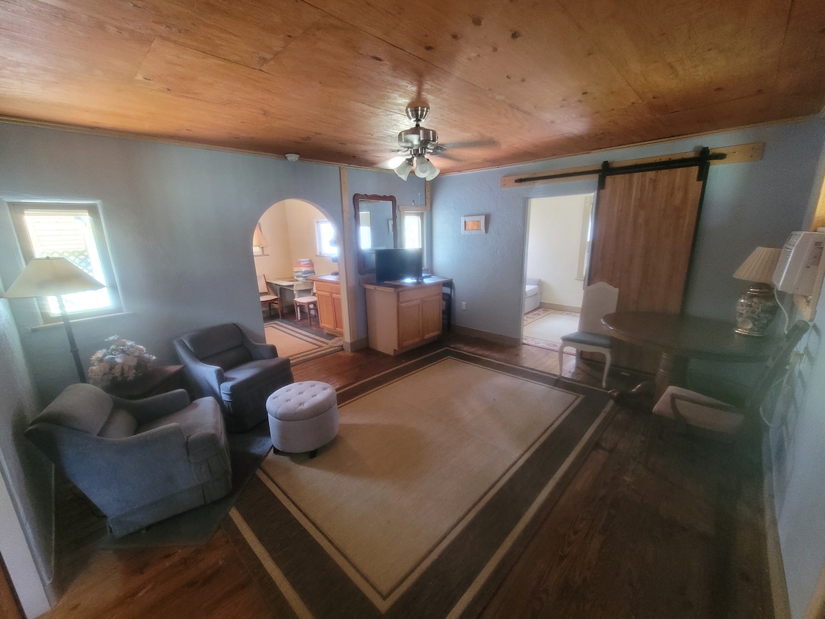 Beautiful log home guesthouse. A get-a-way on acreage, nestled in woody area. Features spacious great room with a cozy lodge feel, 2 bedrooms and 2 full bathrooms. Full kitchen & Laundry. Screened in Front porch, paved driveway and carport. Newly installed working hurricane shutters! Nearby restaurants & many restaurants within 10 Miles. Great for walking, hiking or bicycling. Relax & enjoy The Villages shopping and restaurant offerings but come back to peace, beauty and tranquility. .
