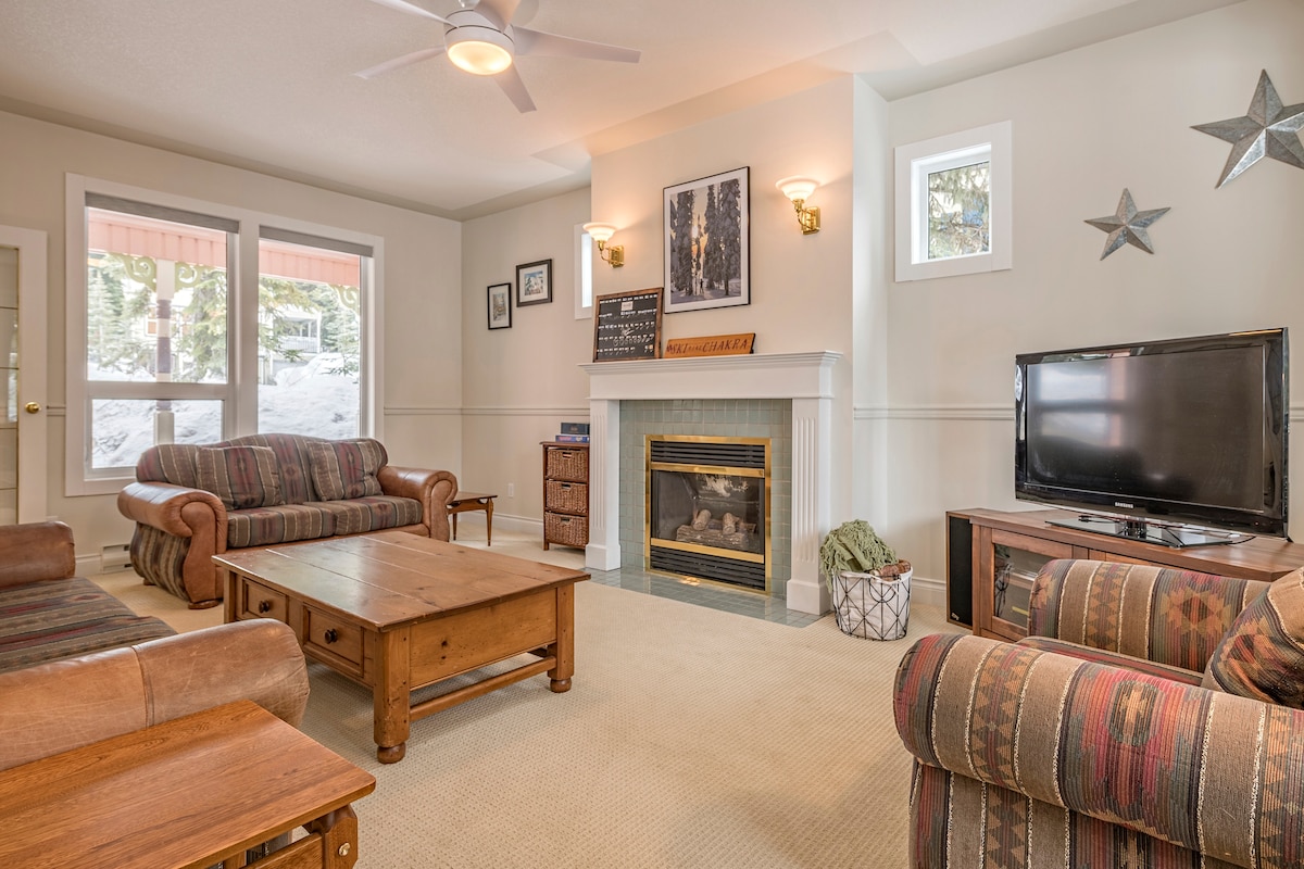 Bright 3 bedroom, 1 bath, 8 beds and sleeps up to 10 people. Perfect for two families. Complete lower condo all on one level with no stairs. Gas FP TV, DVD, unlimited WiFi, Private deck with covered hot tub (available year round) & gas BBQ. Ski-in ski-out with great location situated between the Silver Queen & Silver Woods lifts, a short walk to Tube Town, Brewers Pond or to the village. Shared outdoor area for kids to play Free parking in driveway for 2 vehicles. Free laundry on site.