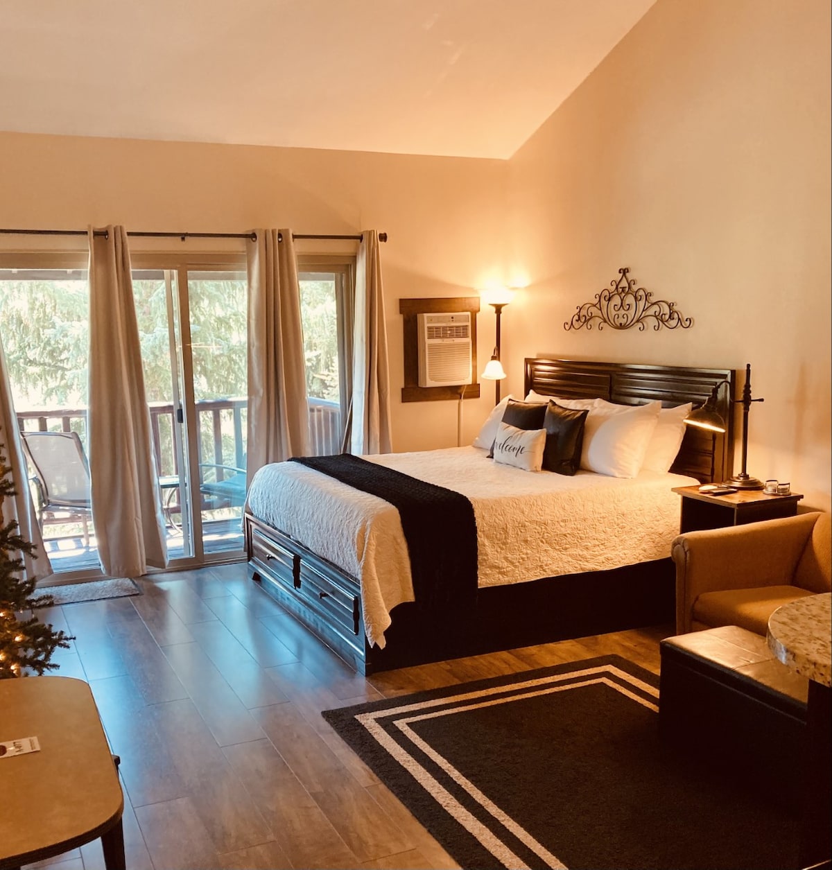 Vaulted upper-level 360 sf studio. Ski resorts & Main St 5 min away (approx 1.5 mile away). FREE bus takes you to resorts/shopping. Overlooks Rail Trail & stream. Full kitchen, gas fireplace, king bed (sleeps 2) and loveseat sleeper (sleeps 1). Hot tub open year round. Pool open during summer months. Restaurants within walking distance. Must climb one flight of stairs. I've designed my studio to feel like your home away from home!