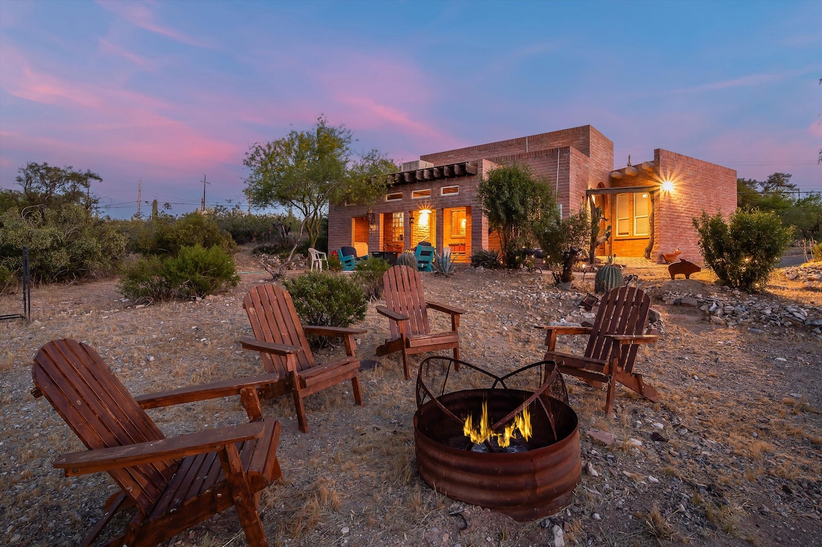2017 guest house in Tucson Mountain foothills adjacent to Sweetwater Preserve (14+ mi.s of trails: mountain biking, horseback, running, & hiking)! Enjoy the giant soaking tub, BBQ grill, sunsets & patio. A full kitchen, sitting area, bath & BR are downstairs (550 sq. ft.). Up a 90-degree ladder to BR/retreat space, wonderful for getaway views. Our property is a 3-acre lot w/ desert flora/fauna, stars, & quietness, yet only 10 mi. from UA. Horses add to the ambiance with a taste of ranch life.