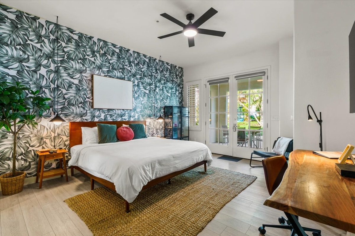 Our Legacy Palms king bed studio suite is a newly renovated, spacious & bright space with a modern California-desert vibe. French doors open to a private balcony overlooking the lush villa grounds & water fountains. The suite features a smart TV with premium cable, mini-fridge, microwave & Keurig coffee maker along with a en-suite bathroom that has a soaking tub & separate shower. The community grounds feature 12 heated pools and spas, a gym, hammocks, grills & much more!
