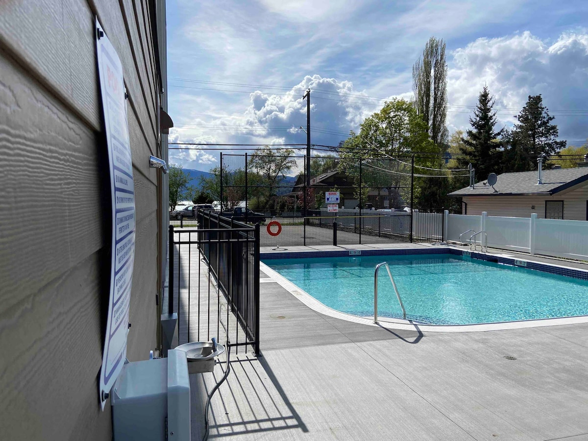 This beautiful studio apartment with a balcony and AC is located at Vita Resort, right across Lakeshore Road from the beach. You're greeted with pool views from your private 3rd floor balcony, and this corner unit feels bright and spacious thanks to windows that provide a valley view. Enjoy beaches on Lake Okanagan right across the street, or relax in our heated pool. There are many things to do in this great neighborhood, so check out our House Manual and Guide Books for full details.