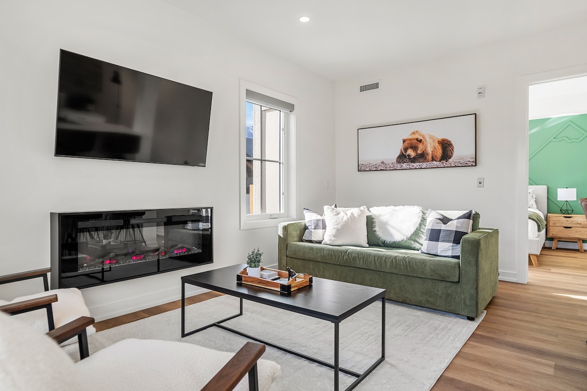 Welcome to your peaceful and stylish Canmore getaway! This luxurious condo is just a 10-minute walk from the town centre, putting shops, restaurants, and trails right at your doorstep. Relax by the cozy stone fireplace, sink into a plush king-sized bed, or host extra guests on the high-quality sofa bed. Enjoy bright, airy living space, fully equipped kitchen, in-suite laundry, complimentary parking, and 1 GB high-speed Wi-Fi. Ideal for adventure or relaxation in the Rockies.