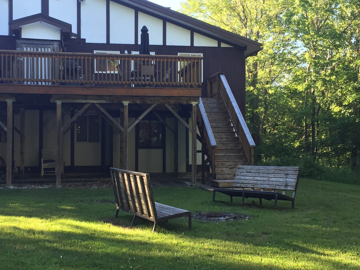 SKI IN AND SKI OUT from the back deck (snow dependent)!! Notice the amount of comfortable seating for NINE PEOPLE around the TV that many other places are without. At the end of a long ski day having a comfortable place for everyone to sit is what most Chalets are missing. Enjoy our family’s beautiful renovated GROUND FLOOR chalet with 2 Bedrooms, 2 Baths, 6 Beds conveniently located next to the Blue Mountain Inn. Blue Mountain Village is a 7 minute walk away. Location, Location, Location