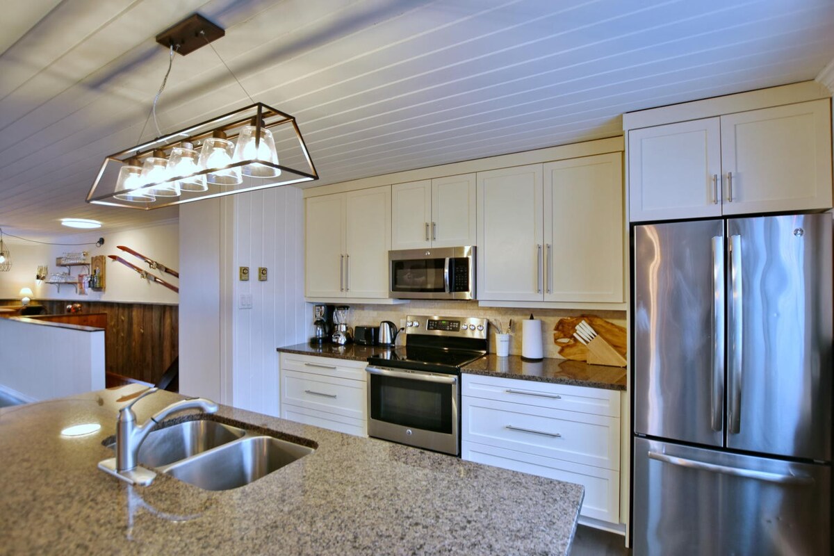 This Ski in/out chalet is only 13 min walk to the nearest Ski Lift. We have an outdoor Hot Tubs, an indoor Sauna, and Entertainment such as a Pool Table, video games and a large 75 inch HD TV for your movie nights. Surround your friends/families around our renovated Kitchen, large Centre Island and large Dining Room Table. Seat in our covered Sunroom to have a morning coffee or enjoy your BBQ food all year round. Worry free and leave your cars at our home: Only 7 min walk to the Village