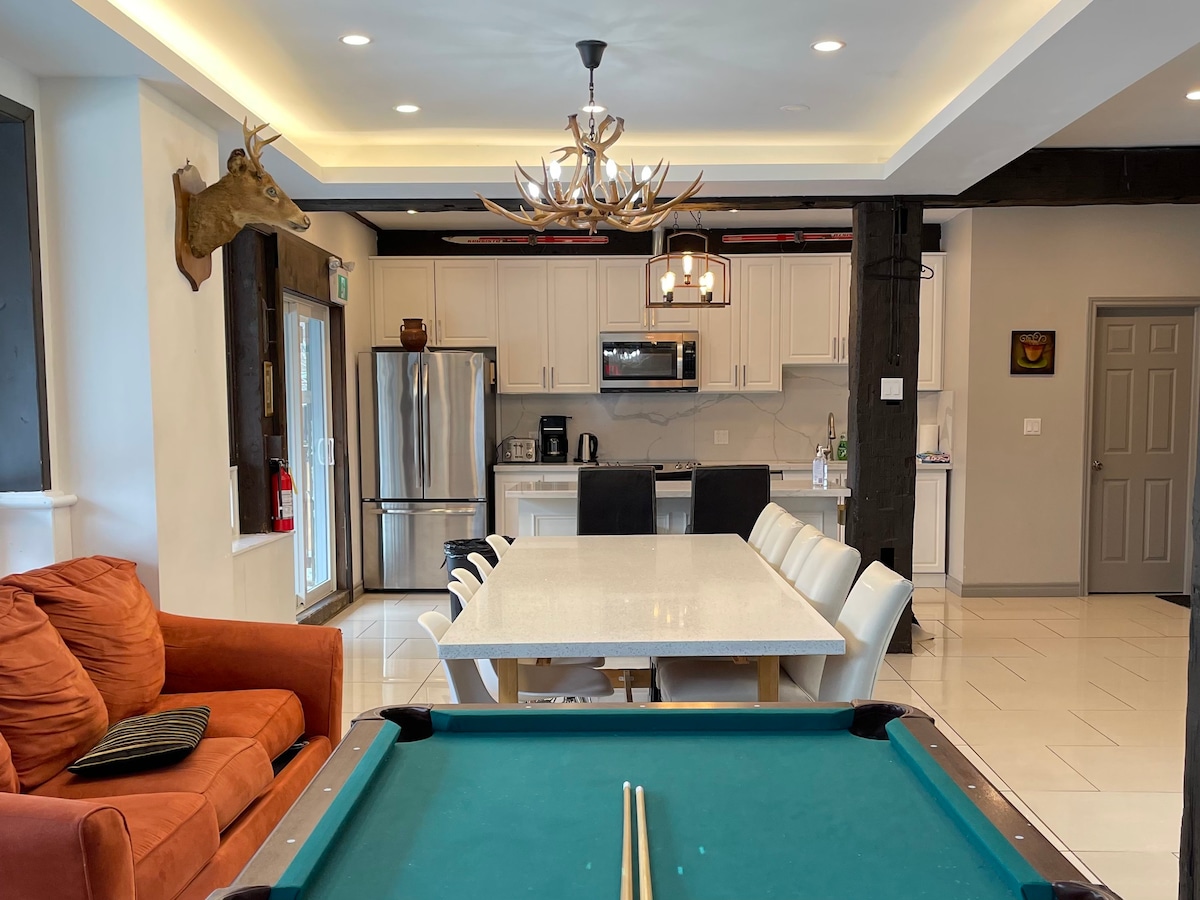 This Ski in/out chalet is only 13 min walk to the nearest Ski Lift. We have an outdoor Hot Tubs, an indoor Sauna, and Entertainment such as a Pool Table, video games and a large 75 inch HD TV for your movie nights. Surround your friends/families around our renovated Kitchen, large Centre Island and large Dining Room Table. Seat in our covered Sunroom to have a morning coffee or enjoy your BBQ food all year round. Worry free and leave your cars at our home: Only 7 min walk to the Village