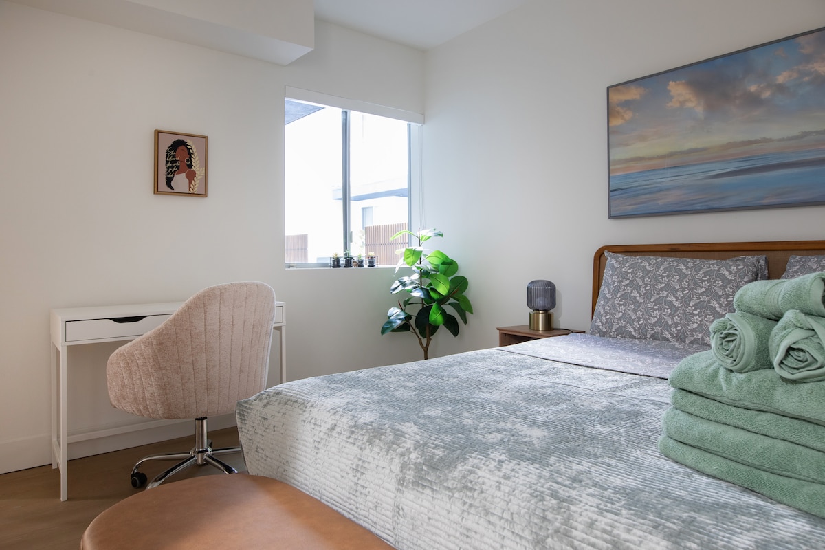 Beautiful newer house with this 2nd floor Apartment. Safe upscale small gated property with owner living next door. Modern design, completely private with separate access, 2 Bedrooms 2 Bath, one King bed one full bed, one sofa bed, sleeps up to 6. High ceilings. 1 covered standard car parking. 5 minutes to the Westfield mall and Village with great restaurants and shopping, 35 min. to downtown, 35 min to the beach and wineries. 1 small dog allowed $75 fee. No parties, smoking, meetings, business.