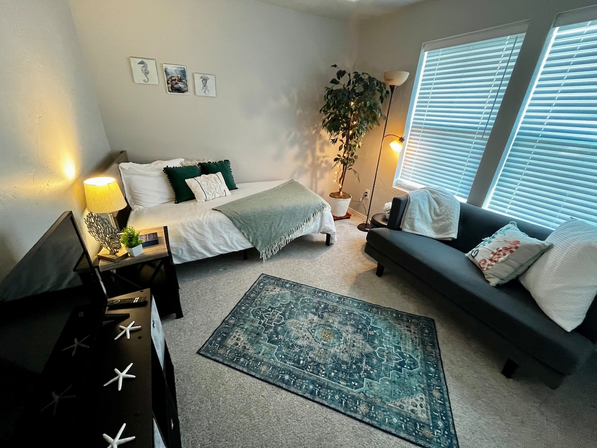 * Casita attached to new home -- No stairs * Private patio * King size bed for 2 adults, bed-side lamps with charging options & outlets, full length mirror & large dresser * Couch, tri-fold memory foam mattress, pac-n-play, & air mattress available, for up to 2 more adults in the living room * 100 MBS Wi-Fi, Smart TV * Keurig with pods: DECAF, regular, tea, cocoa * Small fridge/freezer, microwave, electric tea kettle * Deluxe shower wand, blow dryer * Double closet, iron & ironing board