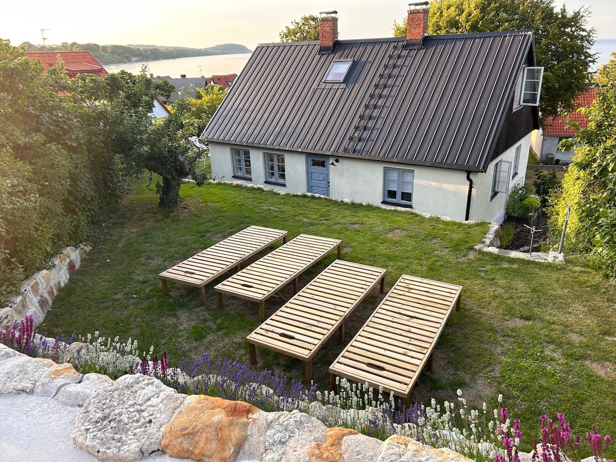 We offer a modern loft-like summer stay overviewing the sea within walking distance from the beach. The house consists of three rooms, one master bedroom with windows from floor to roof towards the fields, an additional bedroom with two single beds, and a living area with kitchen and lounge, also with windows covering the wall towards the garden. Outside there is a lawn, with barbecue and furniture for outdoor living, plus an outdoor shower.