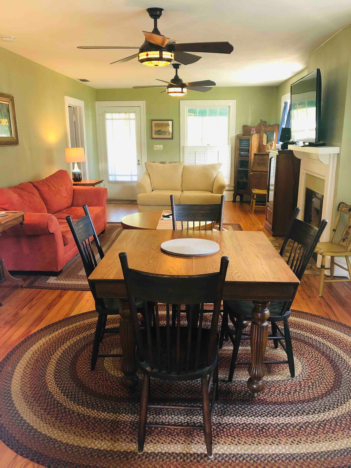 Waterfront ranch Bungalow. Quaint with FP, orig refin hardwood floors, New kitchen with SS appliances, granite countertops, 2 master suites, one with river views. Screened in front porch, garage & floating dock. Washer & dryer. Completely furnished with antiques. Walking path along the river. Step back in time.