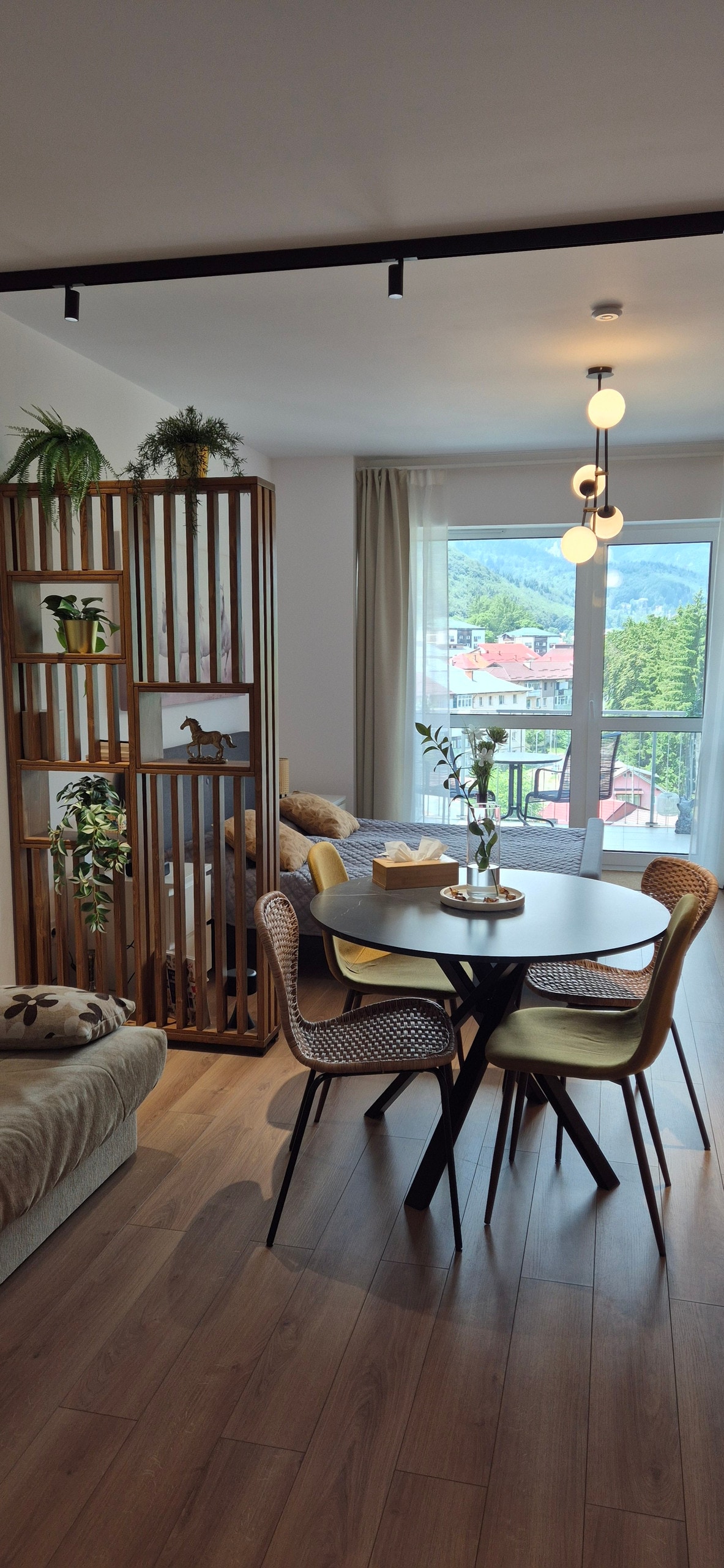 Situat la doar 5 minute de mers cu mașina de centrul stațiunii Sinaia sau pârtia de ski, apartamentul află într-o zonă liniștită a orașului Sinaia, avand o frumoasă vedere spre Munții Carpați. Decorat în nuanțe calde de lemn și pastel, aceasta emana o atmosferă relaxantă și primitoare. Designul boho-chic adaugă un plus de caracter și stil, creând un spațiu unic și confortabil.